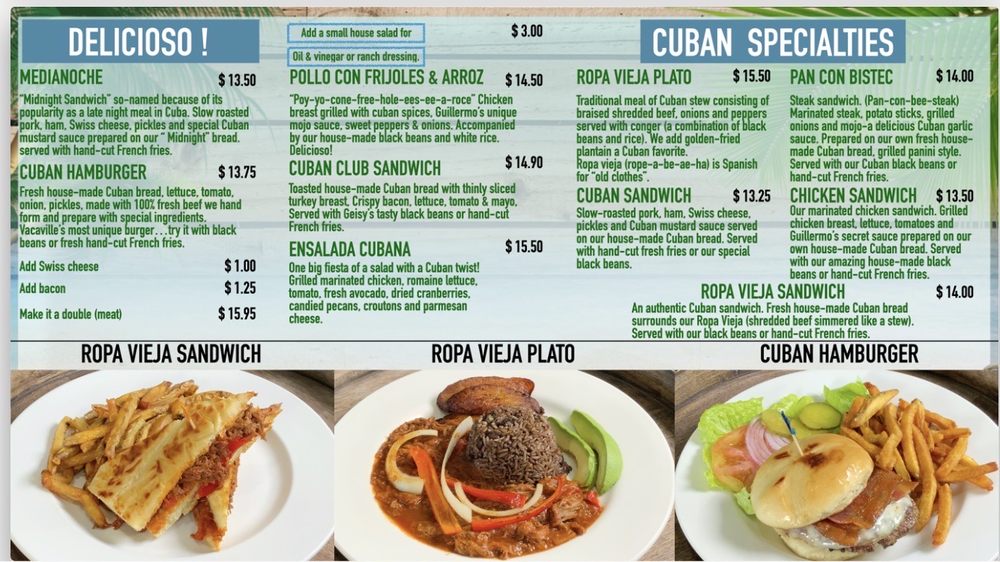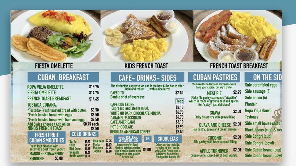 Beyond breakfast, the café serves an array of enticing drinks, including the creamy Caf Con Leche and indulgent White Chocolate Mocha. Diners rave about the attentive service and crisp, clean environment, enhancing the overall experience. Customers highlight the flavorful pollo con frijoles y arroz and the soft, fulfilling pupusas that promise to satisfy your cravings. The café not only serves food; it cultivates a community vibe, inviting you back for more savory journeys. Discover the authentic taste of Cuba right in Vacaville!